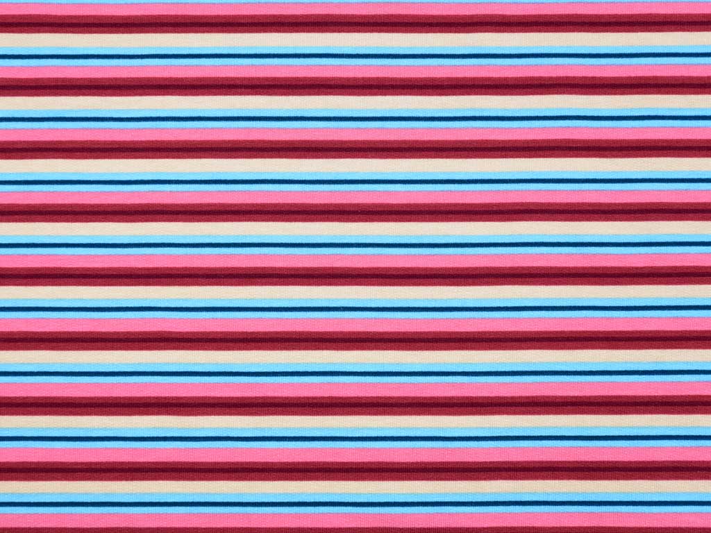 Ein wunderschöner Sommersweat (French Terry) mit Ringelstreifen in rosa, weinrot, hellblau und beige.