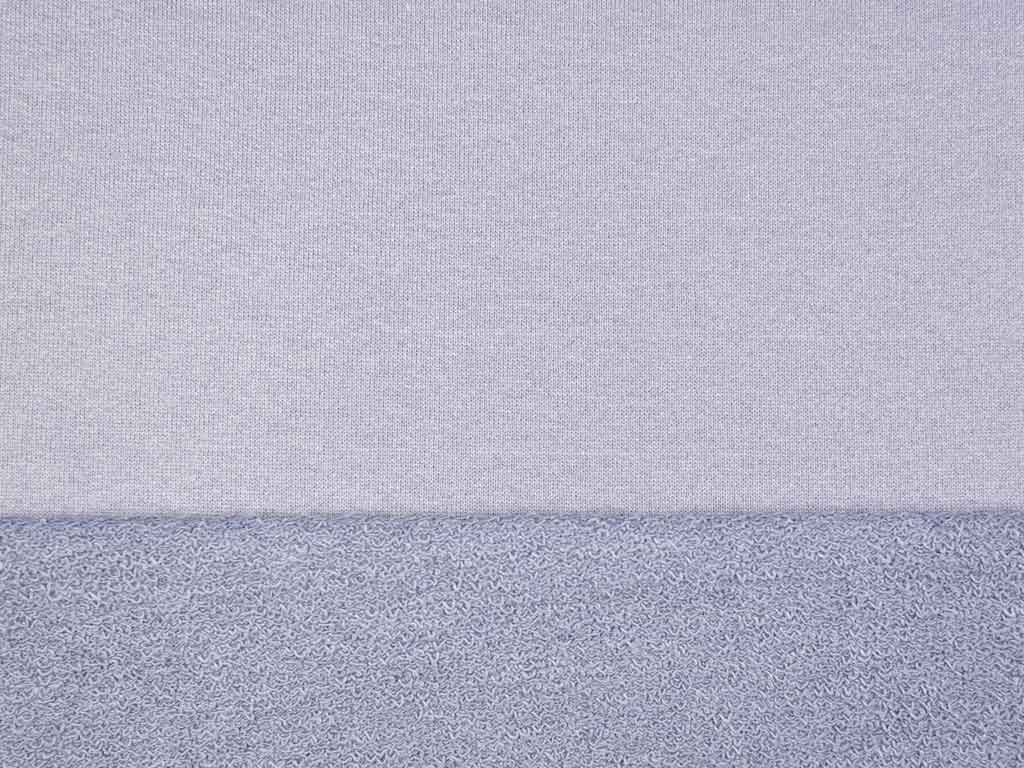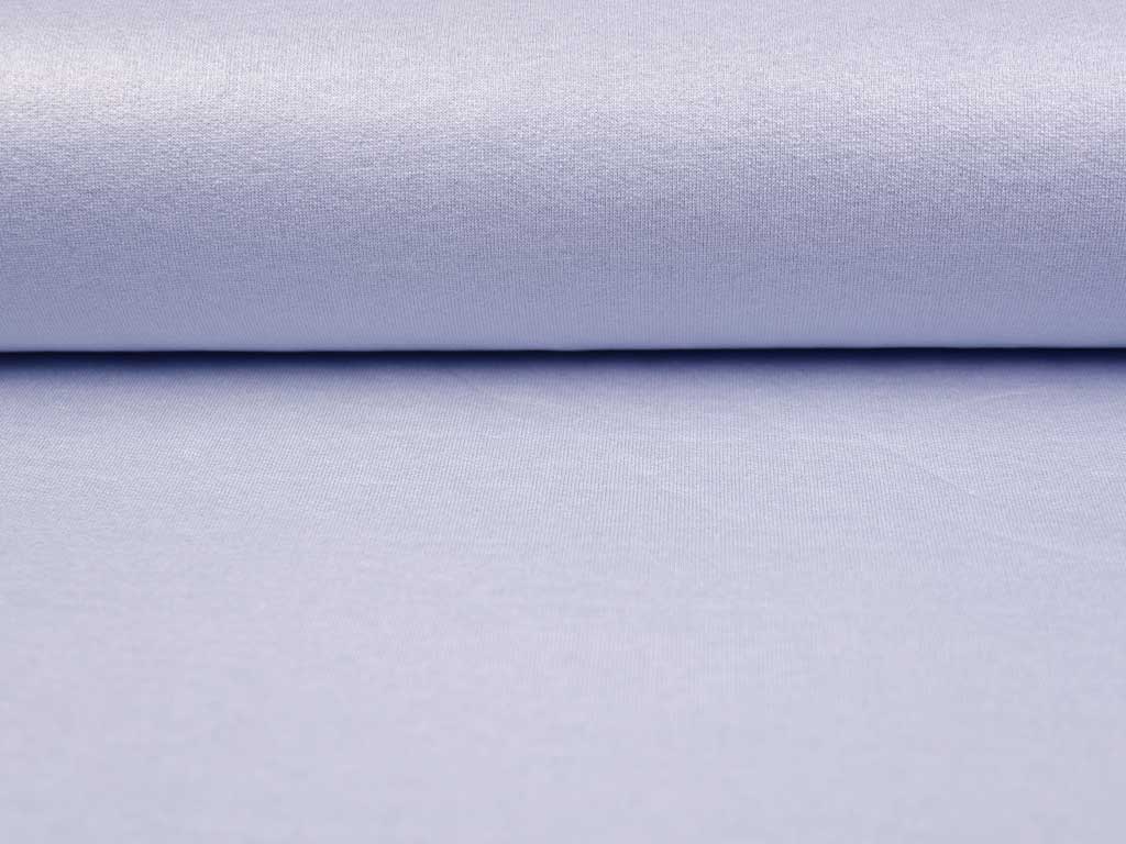 Ein sehr elastischer silberblauer Sweat mit Beschichtung. Der Stoff ist somit wind- und wasserabweisend. Die Haptik der Vorderseite ist glatt und weich. Die Rückseite zeigt die für Sweat typischen Schlingen.