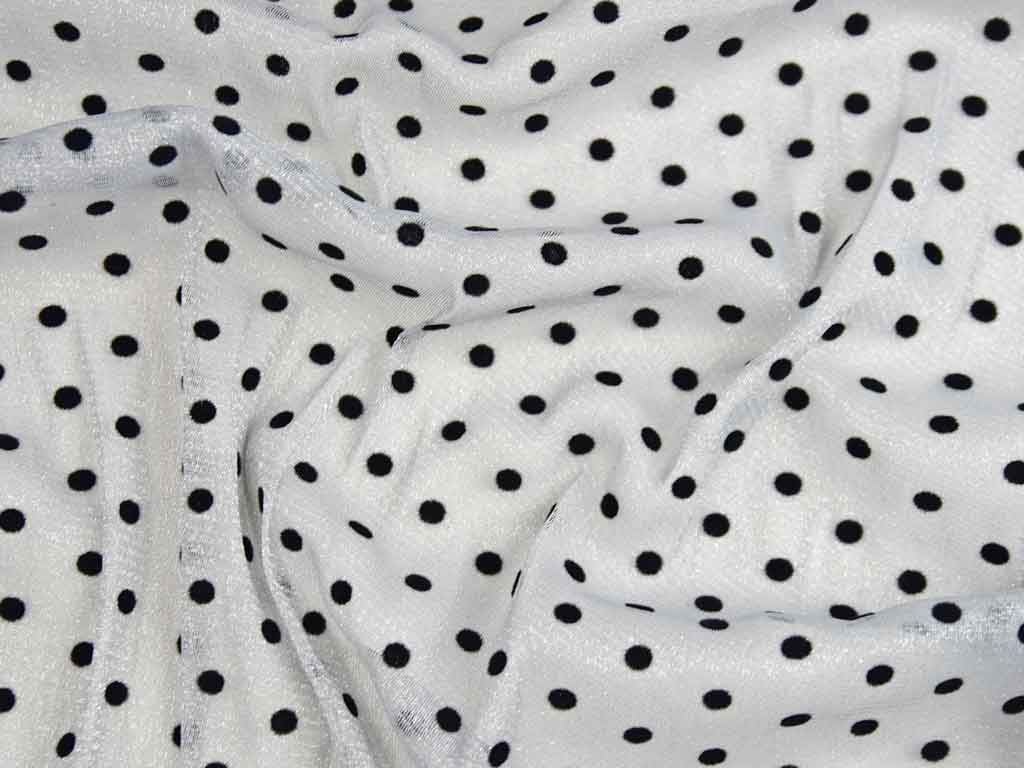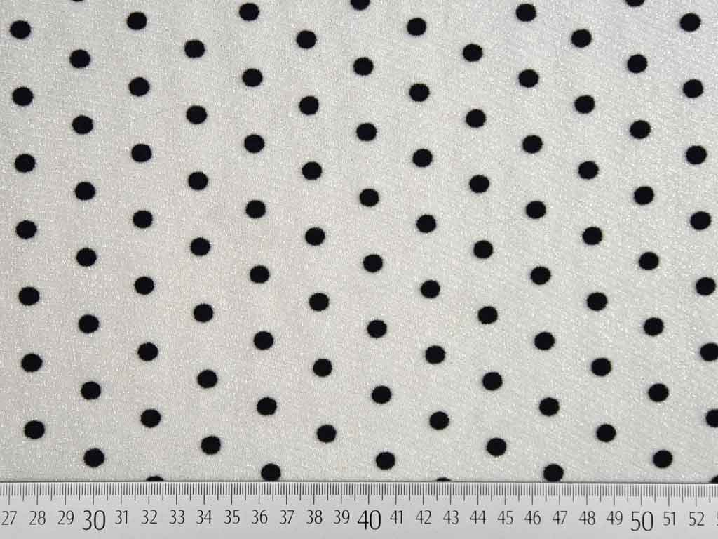 Ein elastischer, silbergrauer Tüll mit eingewebten schwarzen Punkten. Die Punkte haben einen Durchmesser von ca. 0,8 cm. Der Stoff ist weich im Griff und fällt locker.