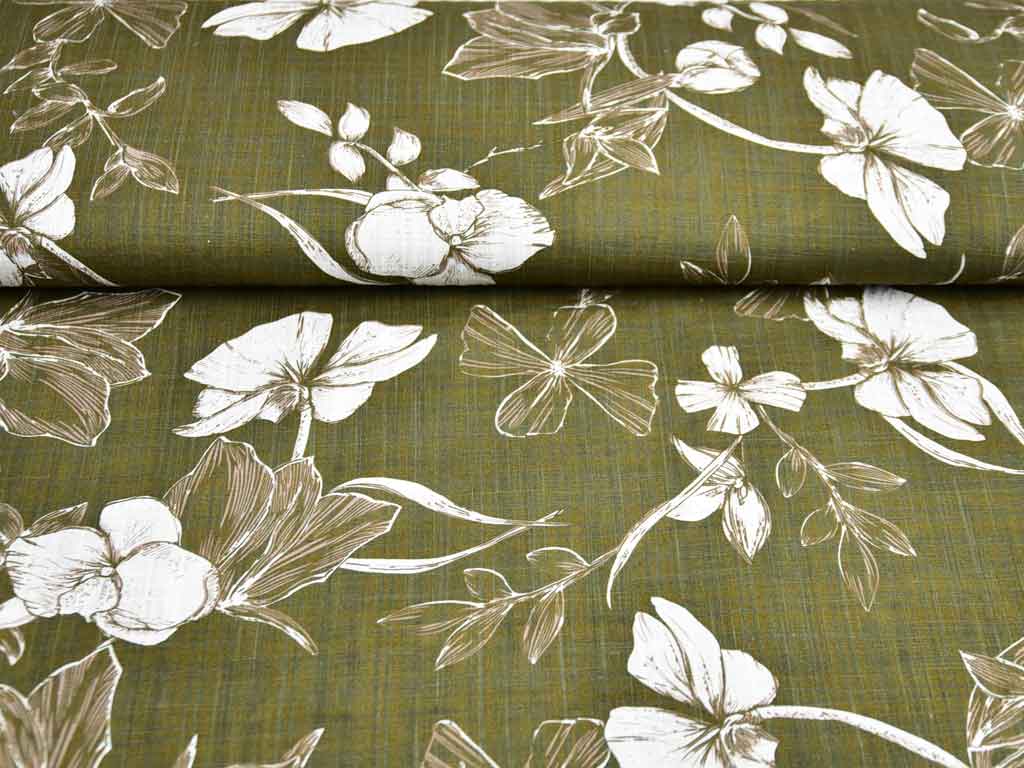 Ein khakifarbener Baumwoll-Viskosestoff mit weißen Blumenblättern. Der Stoff ist mit unterschiedlich dicken Fäden gewebt worden und bekommt somit eine leichte Gitteroptik. Der Stoff ist luftig leicht und hat einen weichen Fall.