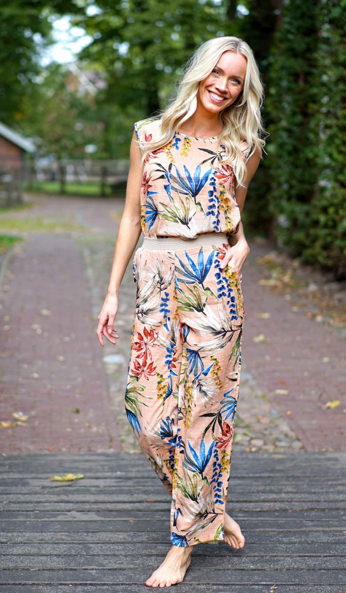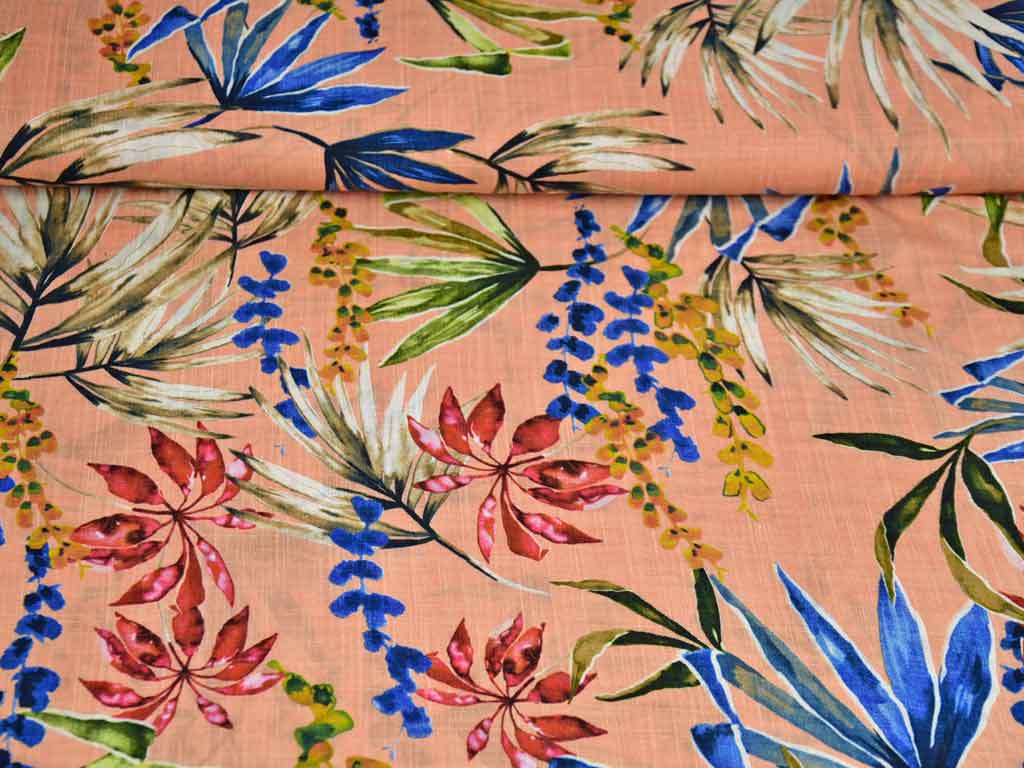 Ein apricotfarbener Baumwoll-Viskosestoff mit tropischen Blättern in Blau, Ocker, Khaki und Rot. Der Stoff ist mit unterschiedlich dicken Fäden gewebt worden und bekommt somit eine leichte Gitteroptik. Der Stoff ist luftig leicht und hat einen weichen Fall.
