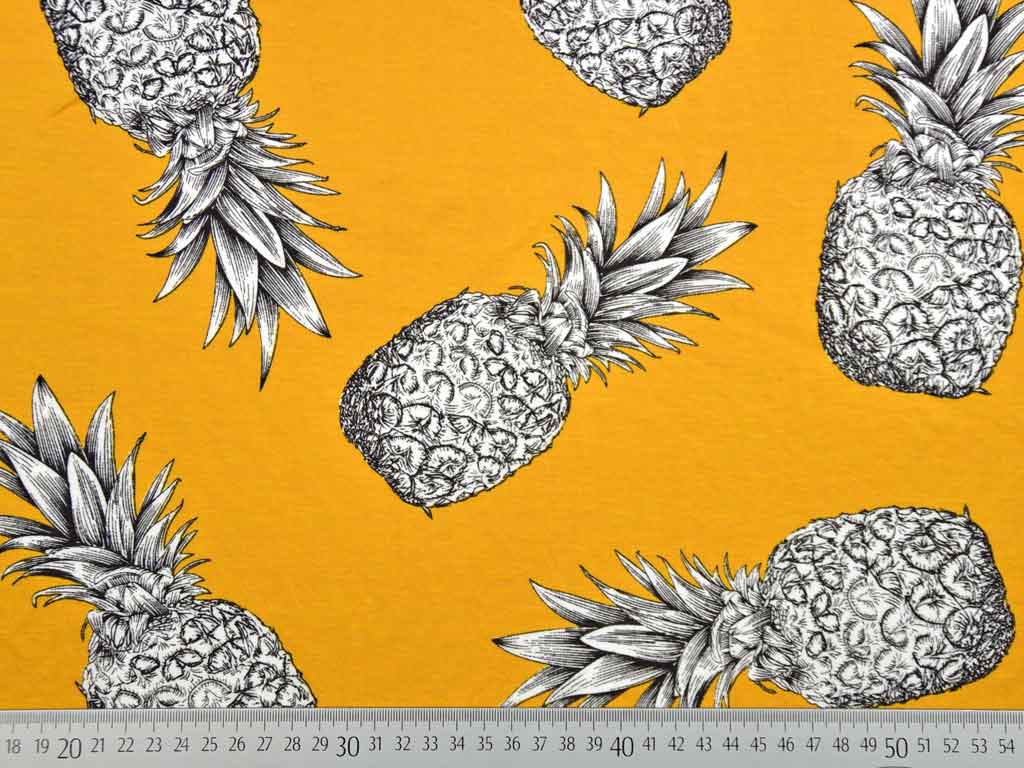 Ein ockerfarbener Viskose Blusenstoff mit großen weiß-grauen Ananas. Durch seine spezielle Webart und Zusammensetzung erinnert der Stoff an Leinen. Der Stoff ist leicht elastisch und er fällt luftig leicht. Als Leinenlook der perfekte Stoff für den Sommer.