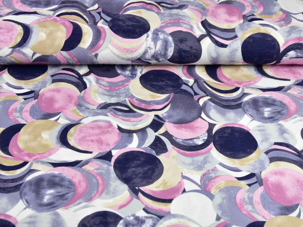 Ein weicher, cremeweißer T-Shirtstoff mit großen Kreisen in Altrosa, Beige, Lilablau und Grau. Der Stoff hat eine leinenartige Struktur bzw. erinnert an eine feine Pique Struktur. Der Stoff fällt luftig leicht und ist somit ideal für den Sommer geeignet.