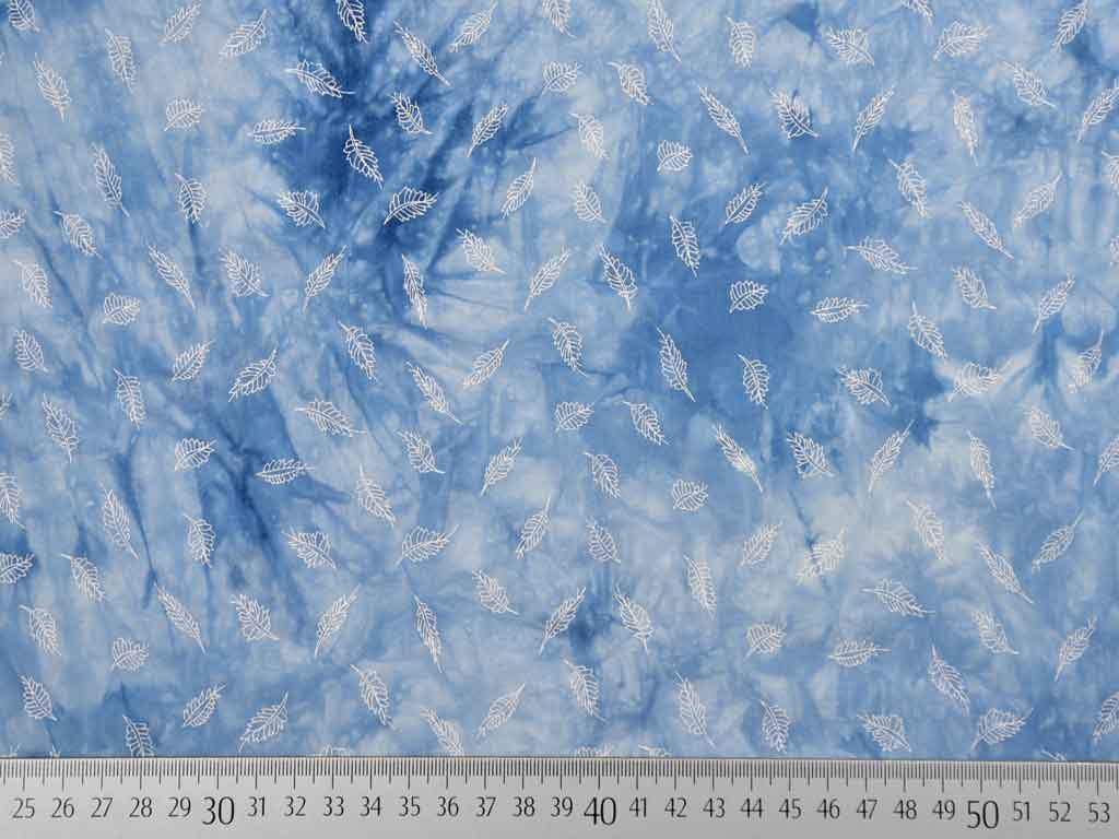 Ein weich fließender Viskosestoff in hellblauem Batiklook bedruckt mit kleinen, weißen Blättern. Der Stoff ist luftig leicht und hat einen weichen Fall.