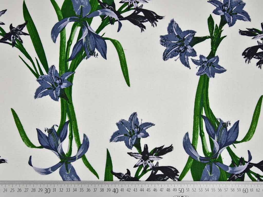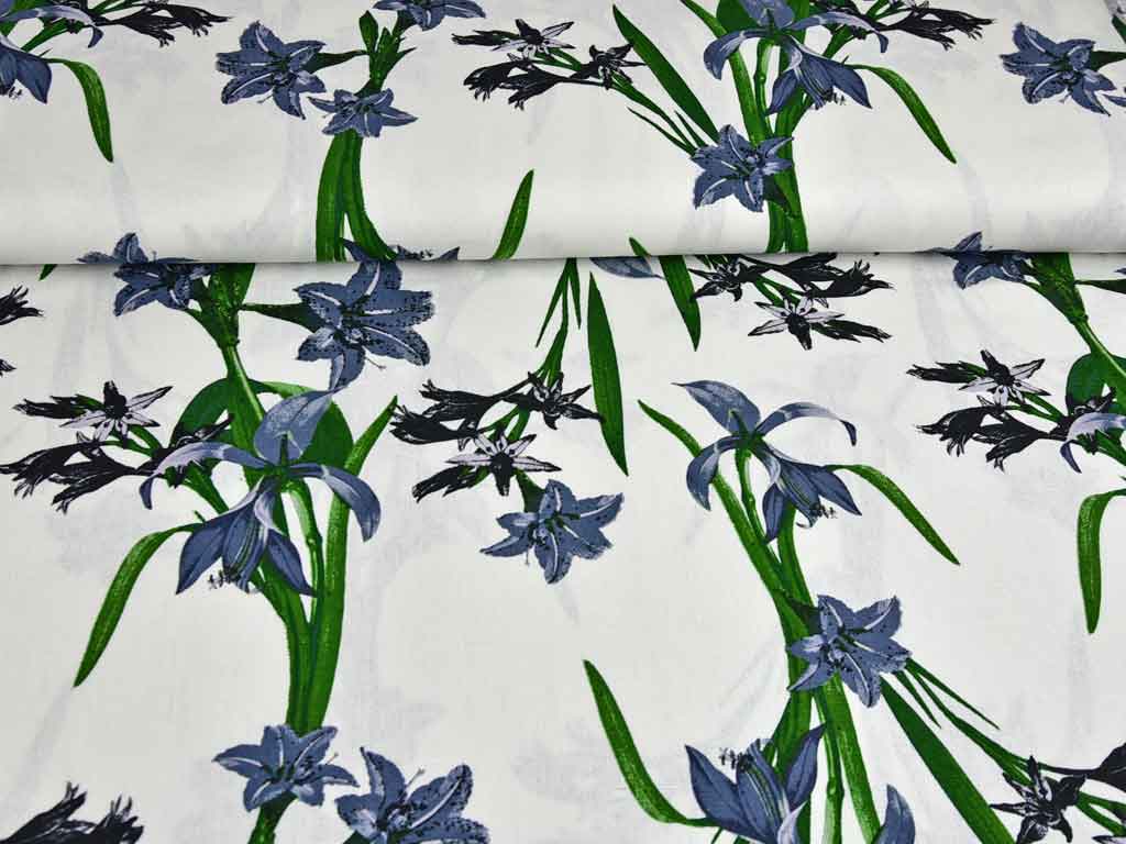 Ein weicher Viskose Leinen Stoff in weiss mit blaugrauen Blumen und grünen Blättern.