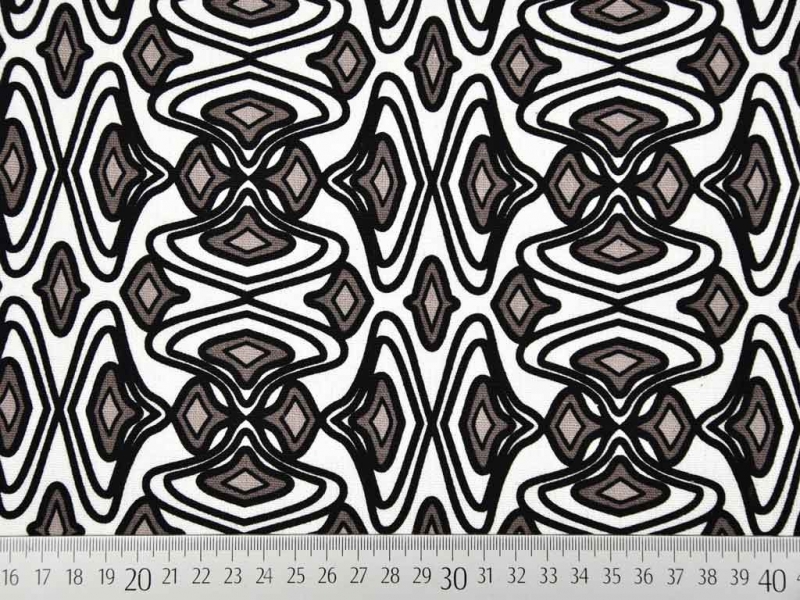 Ein tolles Viskose Leinen Gewebe in cremeweiß mit schnörkeligen Rauten in schwarz mit taupe und helltaupe. Weiche Haptik.