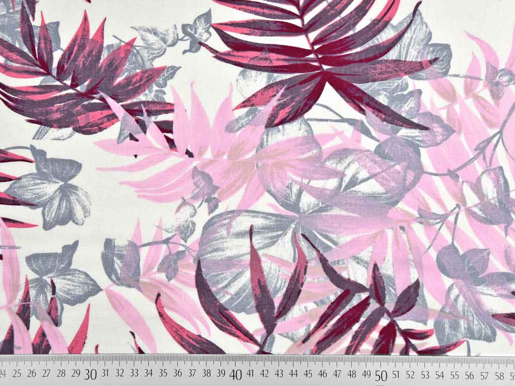 Ein tolles Viskose Leinen Gewebe in cremeweiß mit großen Blättern in rosa und grau. Weiche Haptik.