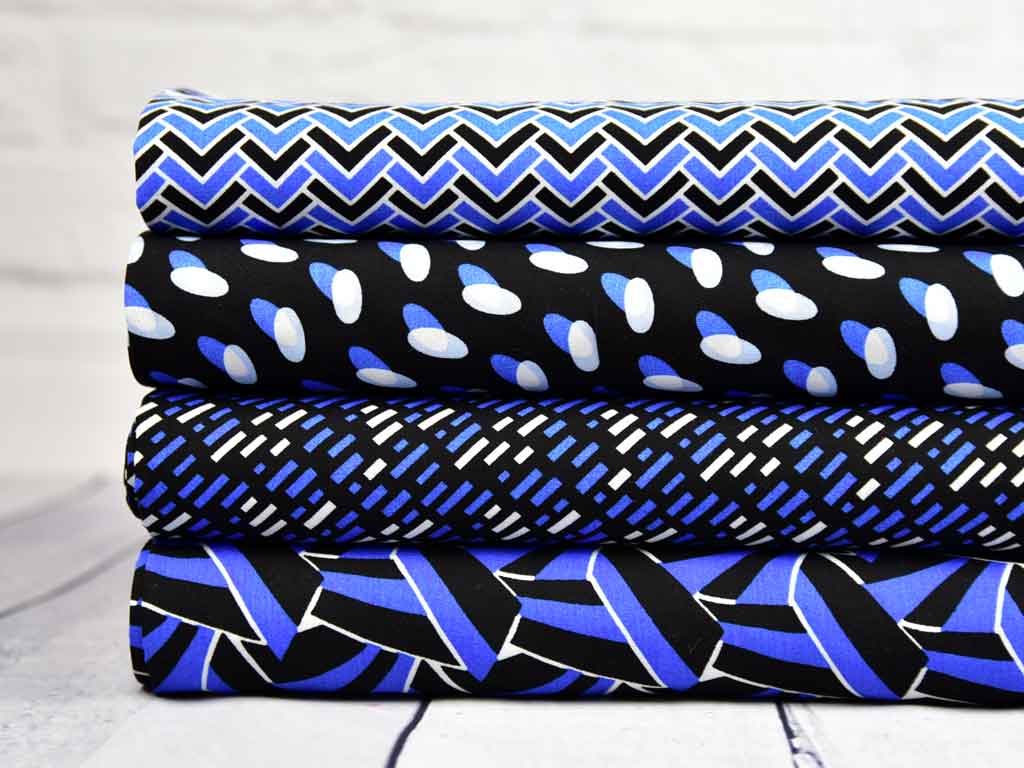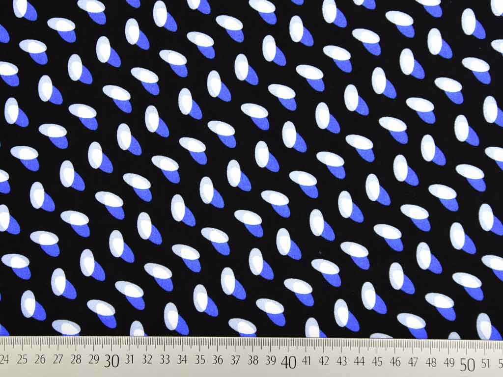 Ein leichter, blauschwarzer Viskosestoff mit royalblauen und weißen Ovalen ganz im Stil von eleganter, italienischer Mode. Das Muster spiegelt den angesagten Italienlook wider. Der Stoff ist luftig leicht und hat einen weichen Fall.