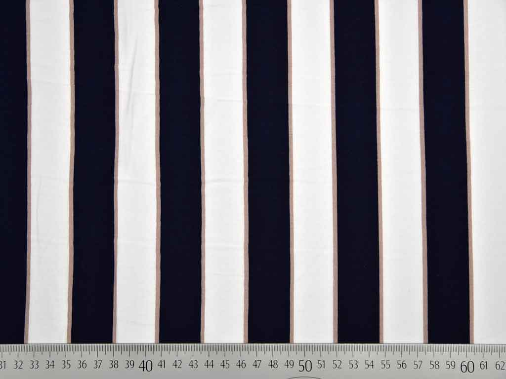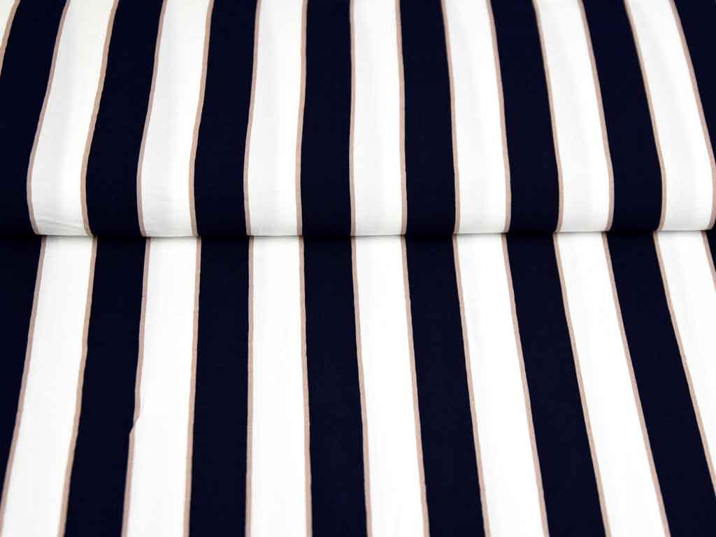 Ein weich fließender Viskosestoff mit weißen und dunkelblauen Blockstreifen sowie schmalen beigen Streifen. Die breiten Streifen sind 2,5 cm breit, die schmalen 3 mm breit. Der Stoff ist luftig leicht und hat einen weichen Fall.