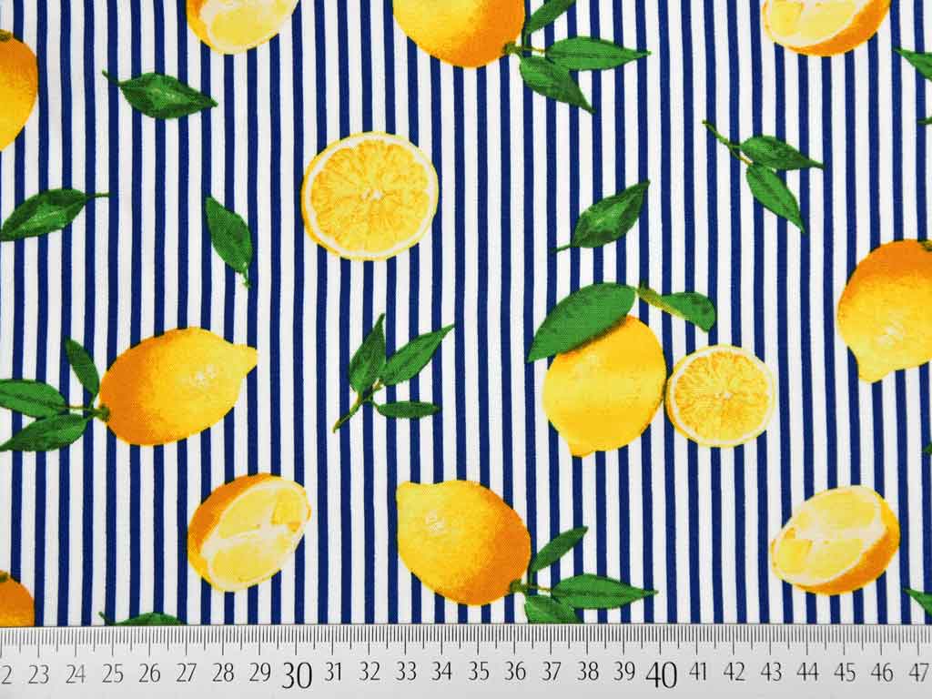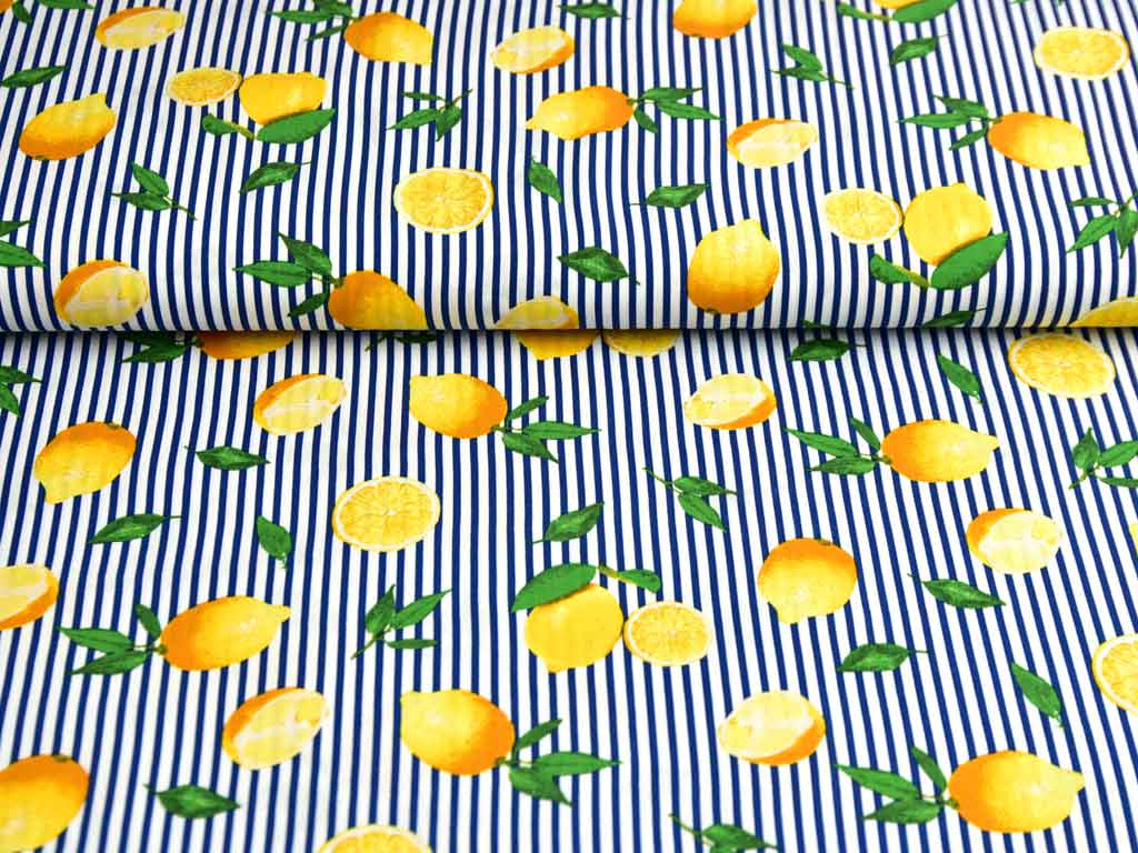 Ein leichter, weiß blau gestreifter Viskosestoff mit gelben Zitronen. Die weißen Streifen sind 2 mm, die Blauen 3 mm breit. Der Stoff ist luftig leicht und hat einen weichen Fall.