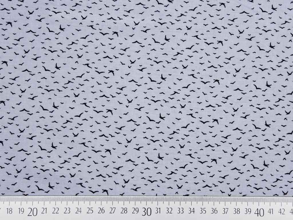 Ein wunderschöner, weicher und fließender Viskose Stoff in hellblau mit kleinen dunkelblauen Vögeln.