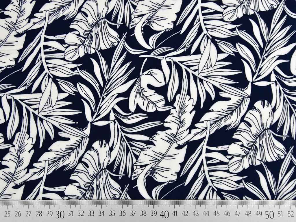 Ein leichter, dunkelblauer Viskosestoff mit großen weißen Blättern im Tropenlook. Der Stoff ist luftig leicht und hat einen weichen Fall.