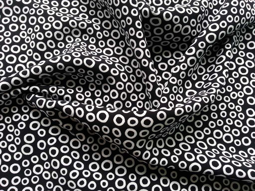 Ein luftig leichter und locker fallender Viskose Stoff mit Kringeln in schwarz und weiss. Weich im Griff.