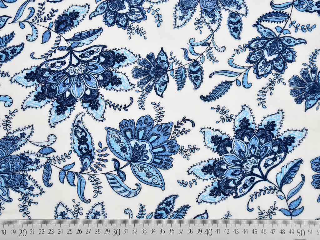 Ein luftig leichter Viskose Stoff in weiß mit opulenten Blumen in jeansblau und dunkelblau.