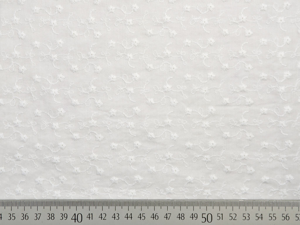 Ein cremeweißer Baumwollstoff (Batist) mit kleinen bestickten Blumen und Ranken. Der Stoff ist leicht und hat einen weichen Griff.