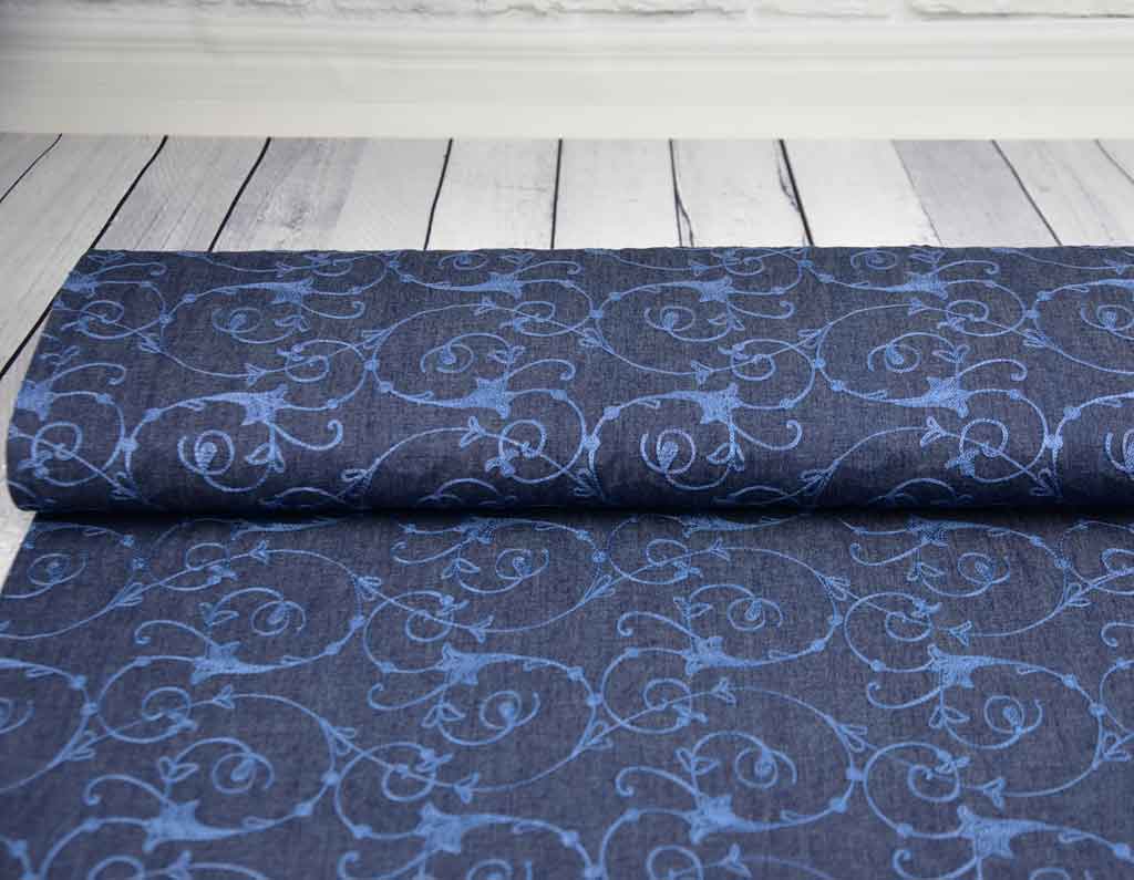 Ein leichter, dunkelblauer Jeansstoff (Chambray ähnlich) bestickt mit blauen Kelchblumen und Ranken (allover).