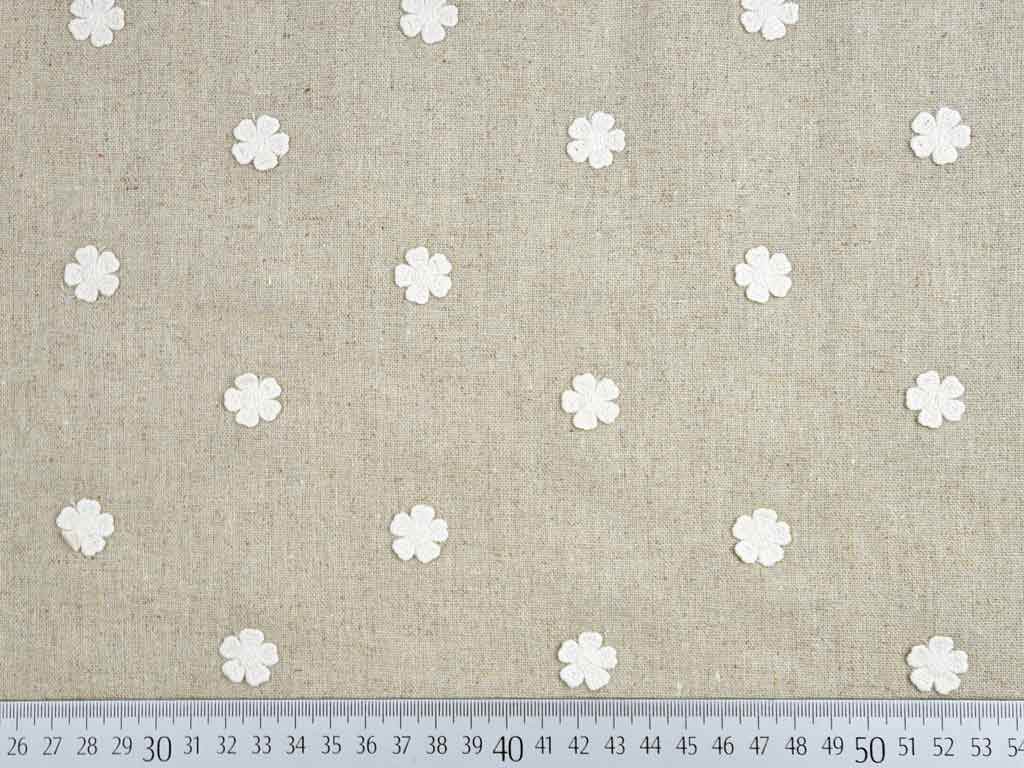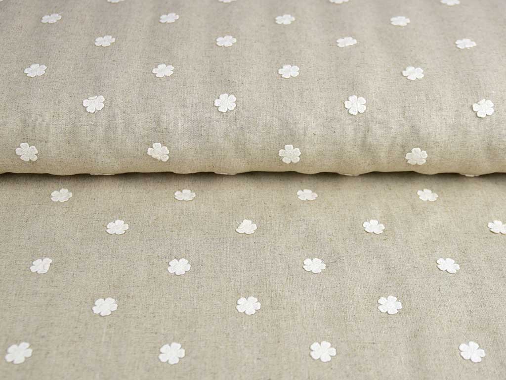 Ein beiger Leinen Viskosestoff mit aufgenähten, weißen Blumenapplikationen. Der Stoff ist uni und erinnert durch seine typische Knötchenoptik an Naturleinen.