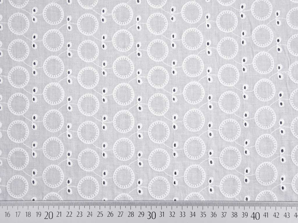 Ein weicher, weißer Baumwollstoff (Batist) bestickt mit Ovalen und Lochstickerei in kleinen Kreisen. Der Stoff ist leicht und hat einen weichen Griff.