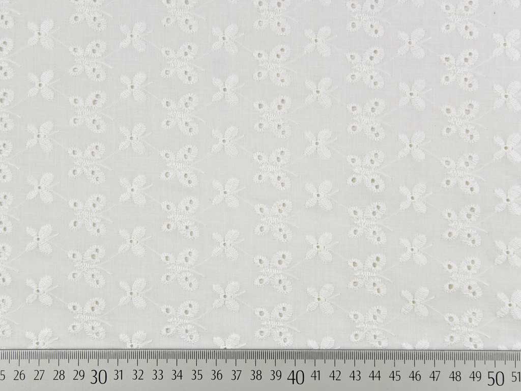 Ein cremeweißer Baumwollstoff mit bestickten Blumen und Schmetterlingen als Lochstickerei. Der Stoff ist leicht und hat einen weichen Griff.