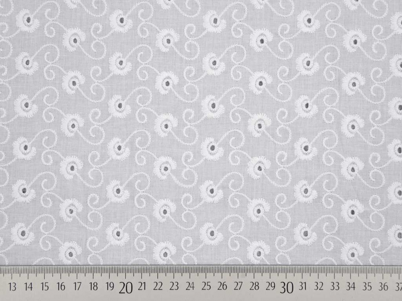 Ein wunderschöner, weißer Batist (leichter Baumwollstoff) bestickt mit Ranken und Schnörkeln (Lochstickerei).