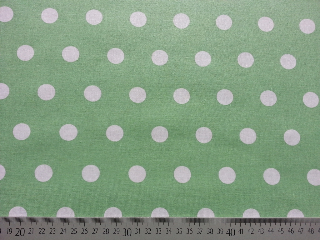 Ein beschichteter Baumwollstoff mit weißen Punkten auf pastellgrünem Grund. Die Punkte sind 1,6cm groß.
