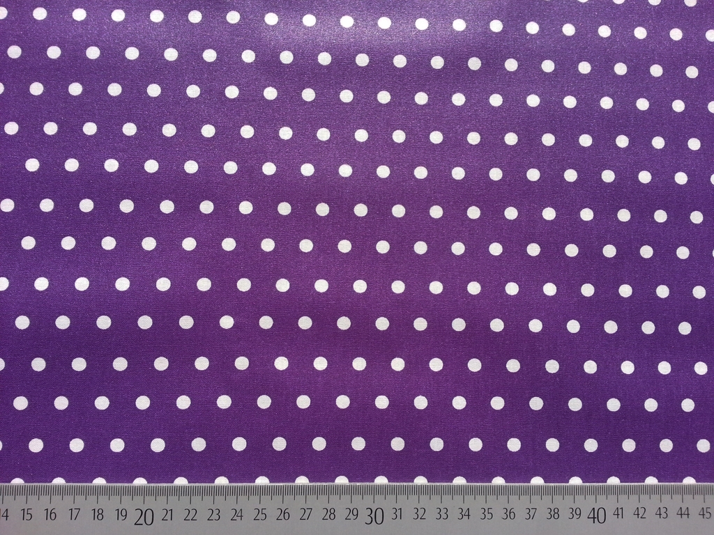 Ein toller beschichteter Baumwollstoff mit 6mm großen weißen Punkten auf dunkellila Grund.