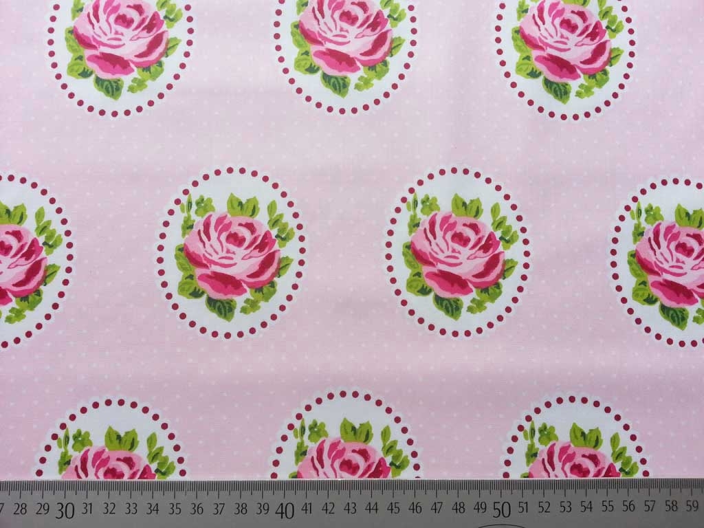 Ein toller beschichteter Baumwollstoff in rosa mit Rosenblüten im Oval. Der Stoff ist schmutz- und wasserabweisend. Er hat trotz Beschichtung einen weichen und stoffigen Griff. Lässt sich vernähen wie normaler Stoff.