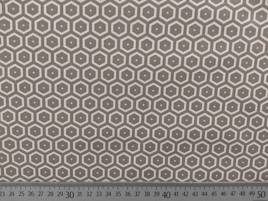Ein beschichteter Baumwollstoff mit Wabenmuster in taupe und weiß. Der Stoff ist schmutz- und wasserabweisend und kann feucht abgewischt werden. Bei Bedarf kann er auch im Schonwaschgang bei 30°C in der Waschmaschine gewaschen werden.