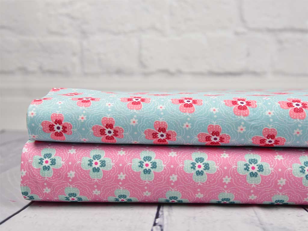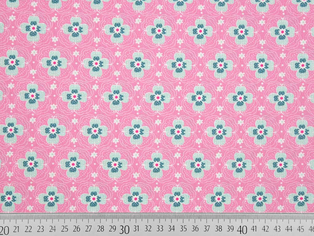 Ein toller beschichteter Baumwollstoff in hellrosa mit Blumen in mint.